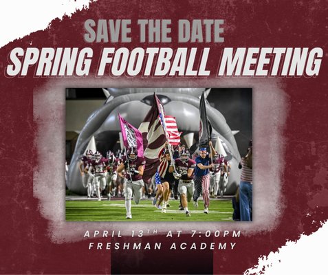 Please save the date for our Spring Parent meeting on Monday, April 13th at 7:00pm in the Freshmen Academy. This will be a chance for you to hear from Coach Merideth about football plans for the summer and the upcoming season and learning about opportunities to get involved with Booster Club. We look forward to seeing you there!