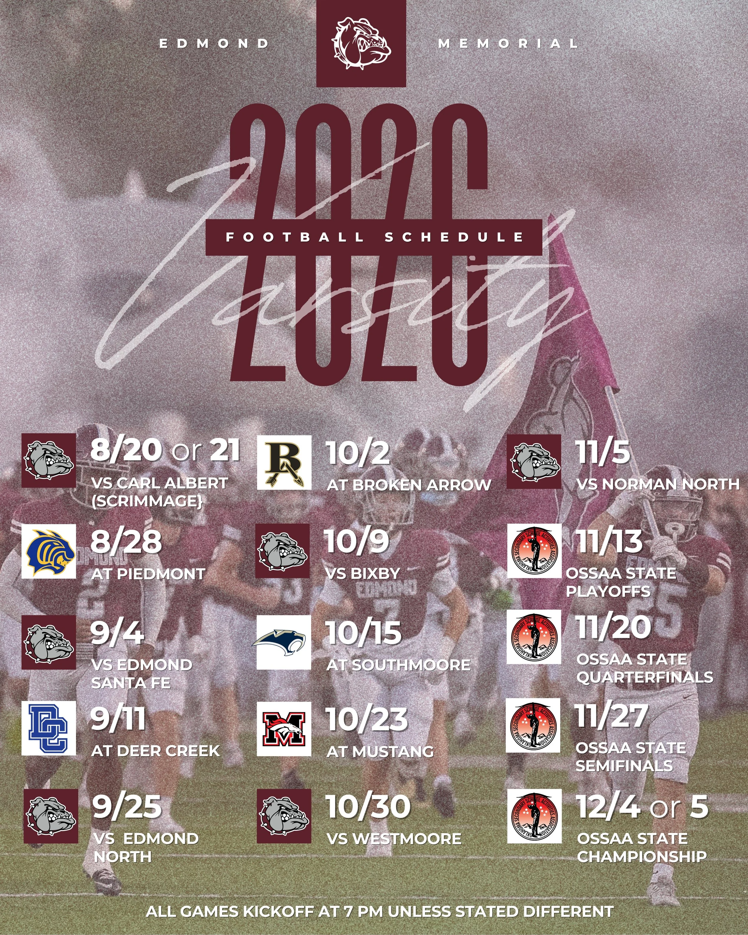 ALL JV GAMES KICKOFF AT 7:00 P.M. (unless stated different)